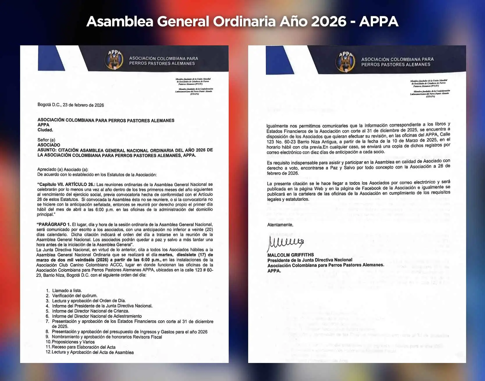 APPA Colombia es miembro activo de la SV y fundador de la WUSV alemana, como también es miembro de la Confederación Americana del Pastor Alemán COAPA.